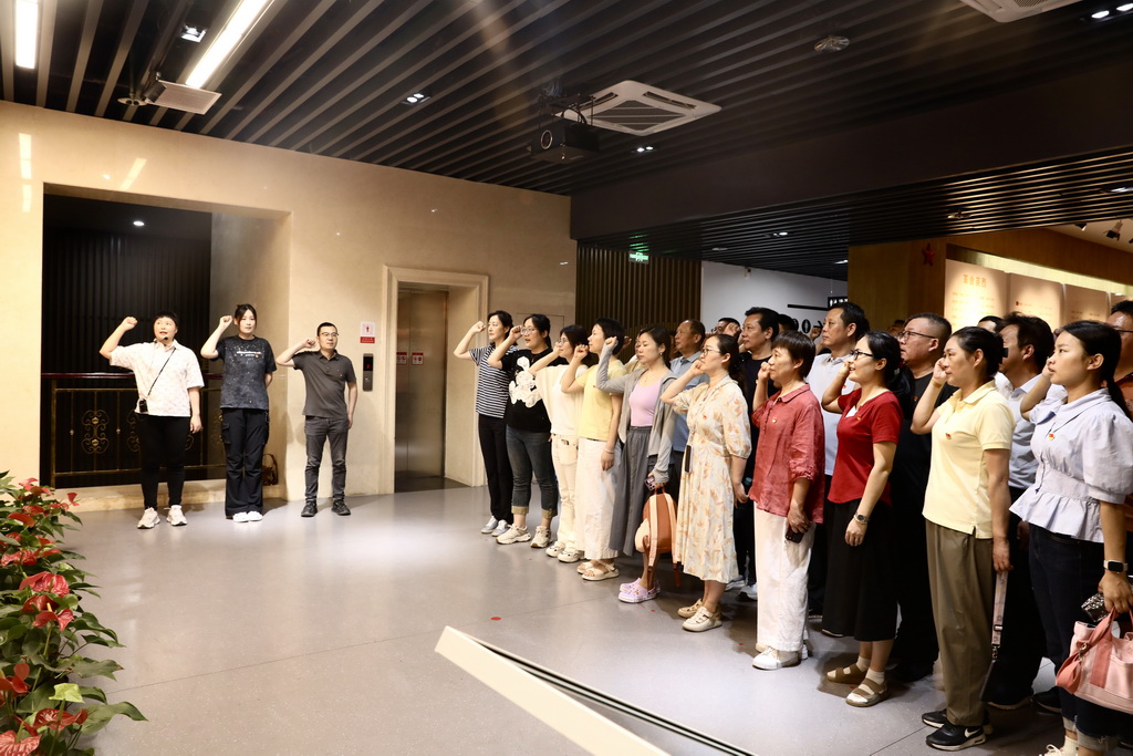 全體黨員步入宣誓廳,舉起右拳,在黨旗下兩名預備黨員莊嚴宣誓,全體黨員重溫入黨誓詞。鏗鏘有力的誓言在紀念館上空回蕩,彰顯著黨員們“對黨忠誠,永不叛黨”的堅定決心。